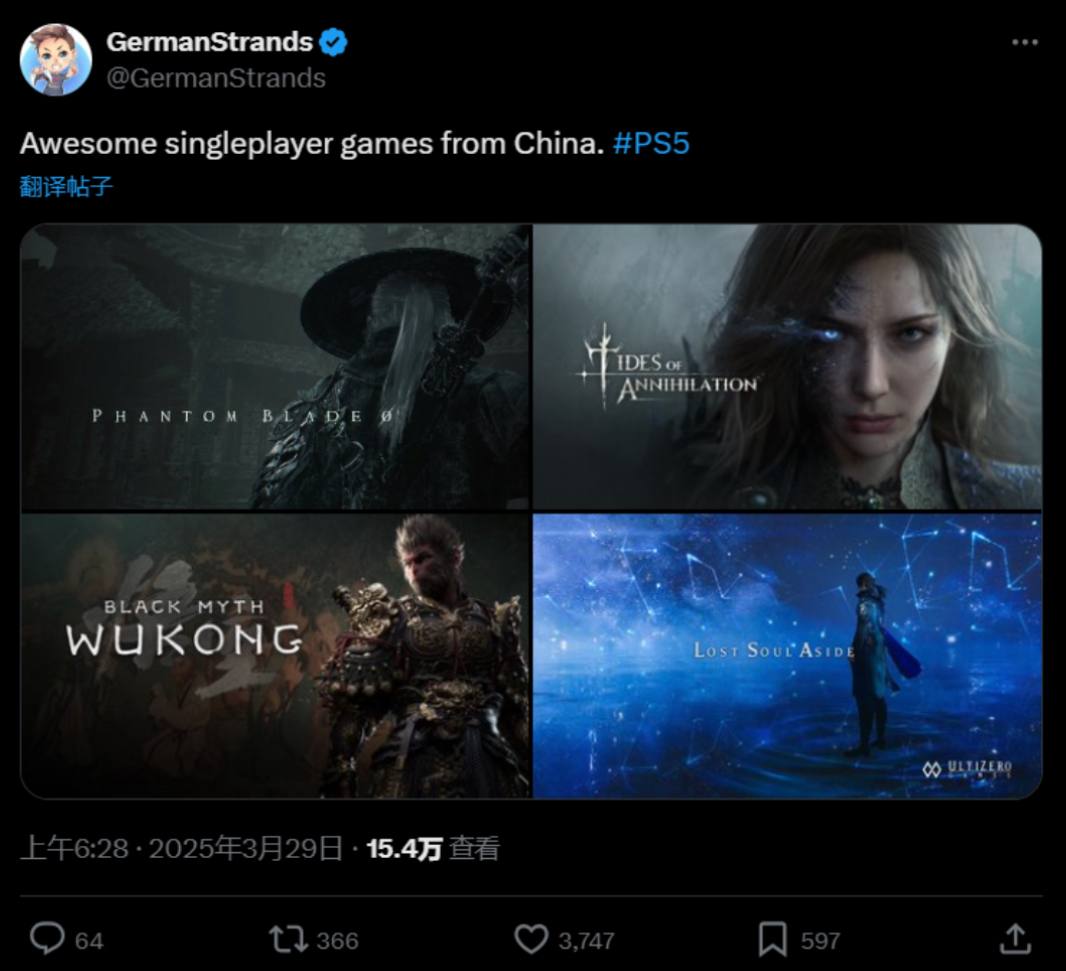 3月30日,海外遊戲博主@GermanStrands發佈的一條動態,配圖展示了部分國產單機遊戲的精彩瞬間,並配文盛讚:“來自中國的優秀單人遊戲。”該帖子迅速在海外社交媒體上引發熱議,眾多玩家紛紛留言表達了對國產遊戲的期待與讚賞。