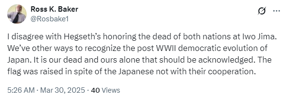 有網友稱:我不同意赫格塞思紀念硫磺島戰役中兩國的陣亡者,只有我們的陣亡者才值得紀念。