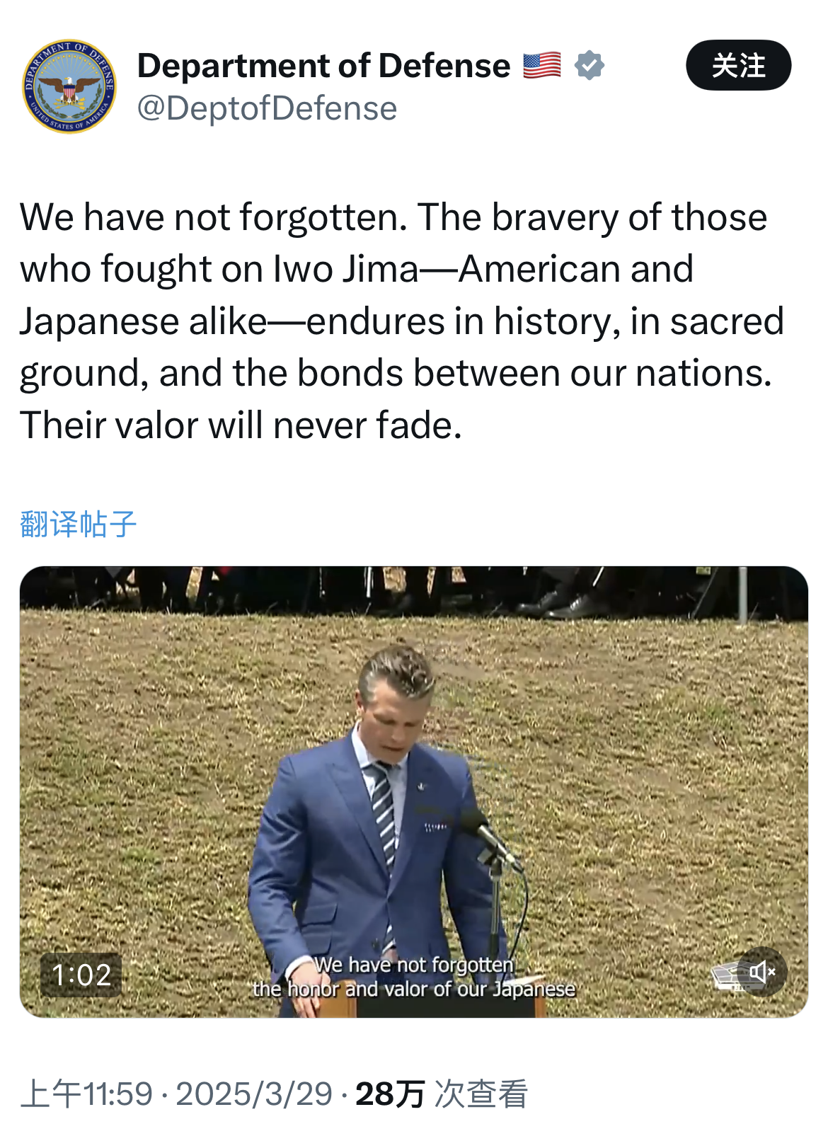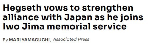 外媒報道:赫格塞思在參加硫磺島戰役紀念儀式上,誓言要加強與日本的聯盟