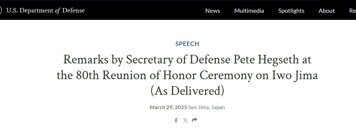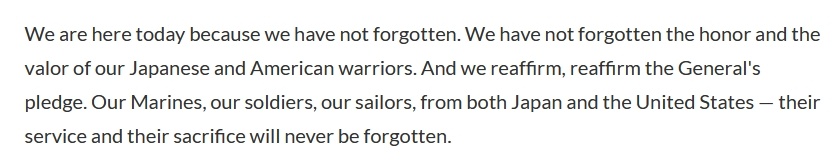 赫格塞思在致辭時稱:“我們不會忘記在硫磺島作戰的美國和日本士兵展現出的勇敢精神。這種精神,將在歷史的長河中、在這片神聖的土地上,以及美日兩國的盟友關係間永垂不朽,他們的英勇事蹟永不褪色。”