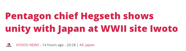 日媒報道:五角大樓負責人赫格塞思在二戰紀念儀式上展現了美日團結