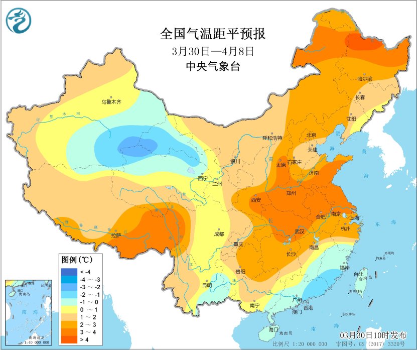 未來10天,除新疆東部、甘肅西部、青海北部及華南東部等地平均氣温較常年同期偏低1~2℃外,我國其餘大部地區氣温較常年同期偏高,其中內蒙古中東部、東北地區西部和北部、華北西部和北部、西北地區東南部、黃淮、江漢、江淮、江南西部和北部及青藏高原東南部等地偏高2~4℃。