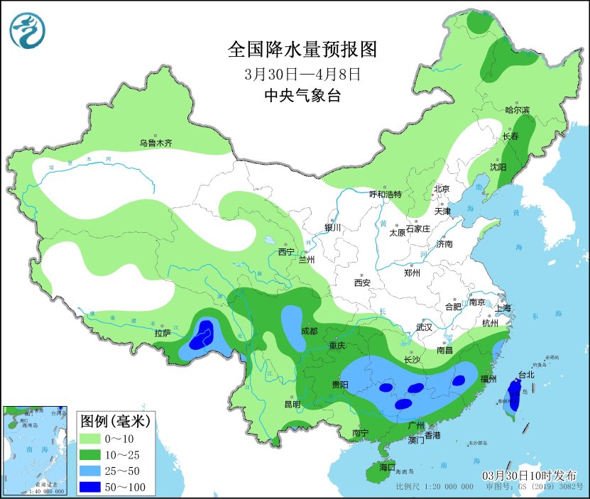 預計未來10天(3月30日至4月8日),江南西部和南部、華南以及西南地區東部等地累計降水量有10~20毫米,其中,江南南部和華南北部等地局地有40~60毫米;新疆北部、東北地區北部和東南部、華北北部等地累計降水量有3~8毫米,局地10~20毫米。與常年同期相比,全國大部地區降水量偏少。