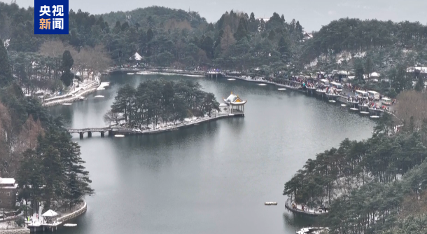 在九江市,廬山風景區一場降温降雪天氣過程後,積雪最深達4釐米。從高空俯瞰,廬山牯嶺鎮、如琴湖覆蓋了一層薄雪,乾淨剔透。白雪嵌入蒼翠山體,融為一體,美得如同一幅水墨畫。早春盛開的桃花、梅花、櫻花等花卉,被冰雪凝凍,晶瑩透亮,嬌羞無比,宛若“冰雪童話世界”,吸引不少遊客駐足欣賞拍照。