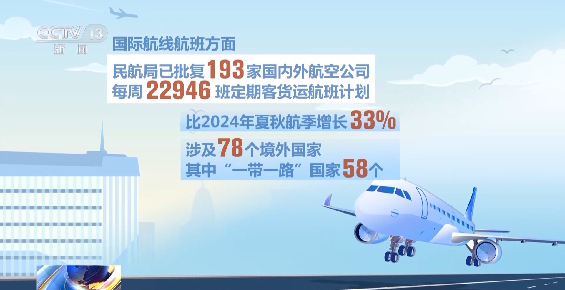 此外,國際航線航班方面,民航局已批覆193家國內外航空公司每週22946班定期客貨運航班計劃,比2024年夏秋航季增長33%,涉及78個境外國家,其中“一帶一路”國家58個。
