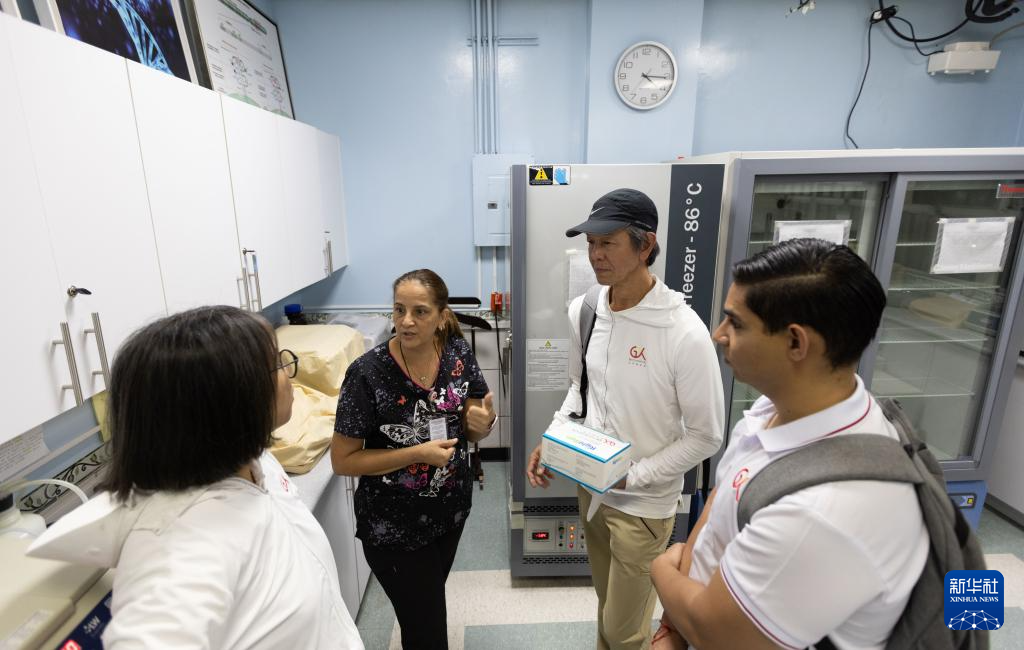 3月24日,在洪都拉斯首都特古西加爾巴的埃斯庫埃拉醫院,共享基金會團隊向醫護人員瞭解快速檢測包使用情況。新華社記者 李夢馨 攝