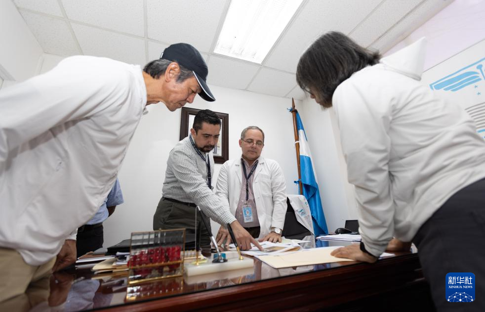 3月24日,在洪都拉斯首都特古西加爾巴的埃斯庫埃拉醫院,共享基金會團隊與醫院工作人員討論淨水設備安裝方案。新華社記者 李夢馨 攝