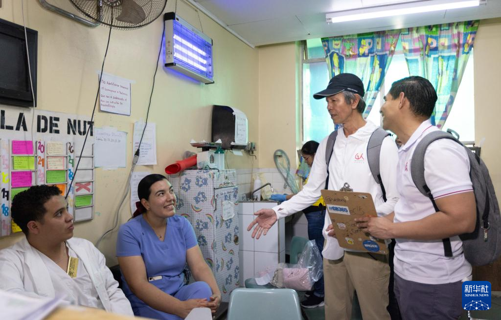 3月24日,在洪都拉斯首都特古西加爾巴的埃斯庫埃拉醫院,共享基金會團隊向醫護人員瞭解滅蚊燈使用情況。新華社記者 李夢馨 攝