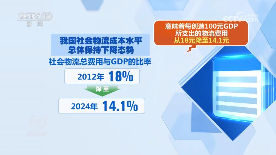 作為我國統一大市場建設的關鍵一環。近年來,我國社會物流成本水平總體保持下降態勢。社會物流總費用與GDP的比率由2012年的18%,降至2024年的14.1%,這意味着每創造100元GDP所支出的物流費用,從18元降至14.1元。不過,與發達國家相比,我國社會物流總費用佔GDP的比重仍然較高。