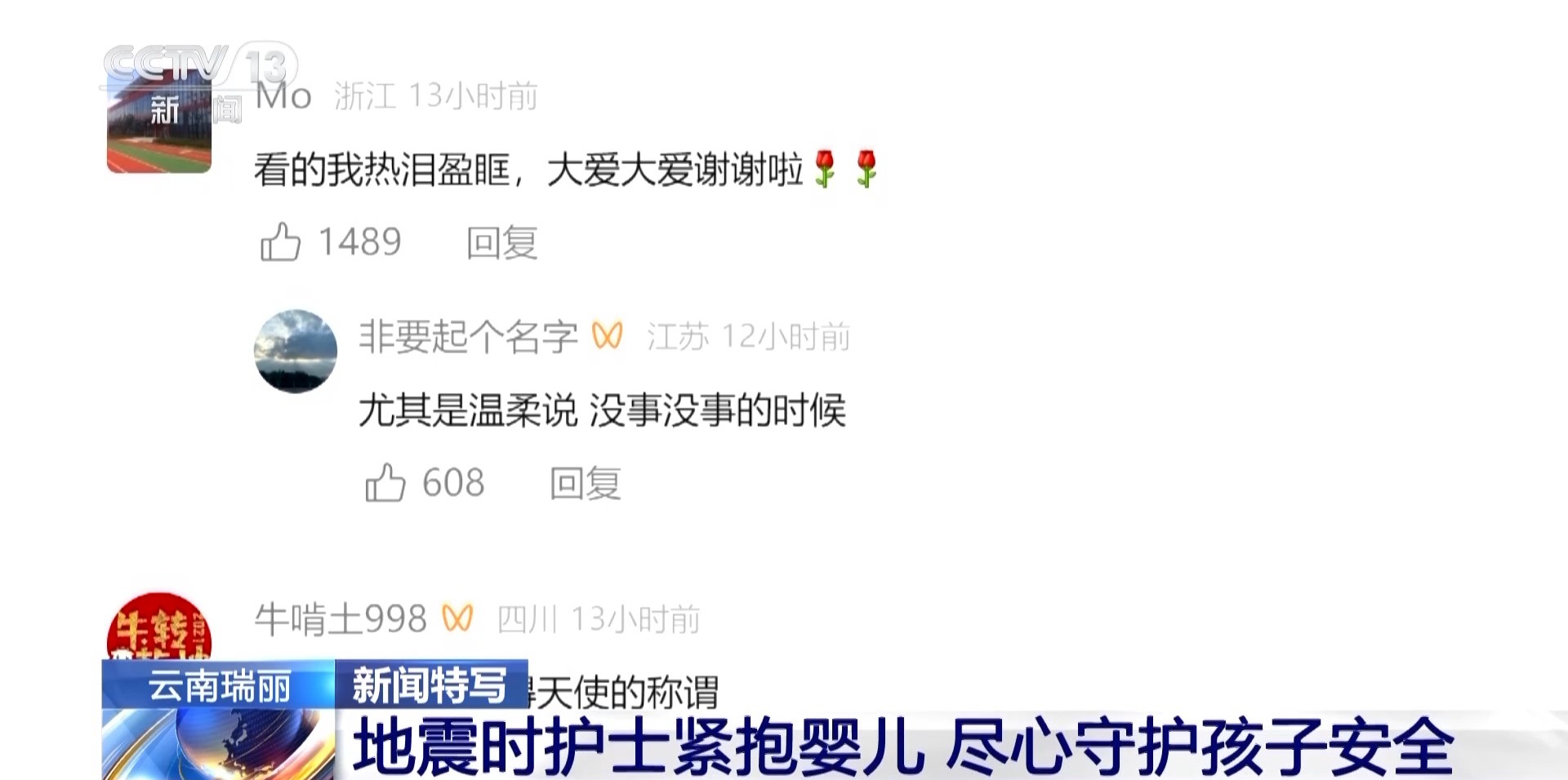 *瑞麗某月子中心護士 熊街蘭:*根本就沒來得及反應,就只能把寶寶迅速地抱起來,那個時候也很着急,就是想説能趕緊保護着。我們的護士李曉親,她也是把其他幾個寶寶先推在一起。當時晃動得特別厲害,我就只能先護着我懷裏的那個寶寶,可能那個晃動的力度太大了,就有點嚇到寶寶了,我就趕緊安慰一下他,説沒事沒事,趕緊安慰一下他。因為他也是兩個多月的寶寶了,這樣的話,他也能聽到,他能感受到你安慰他,後面立馬就安靜下來了,挺乖的。