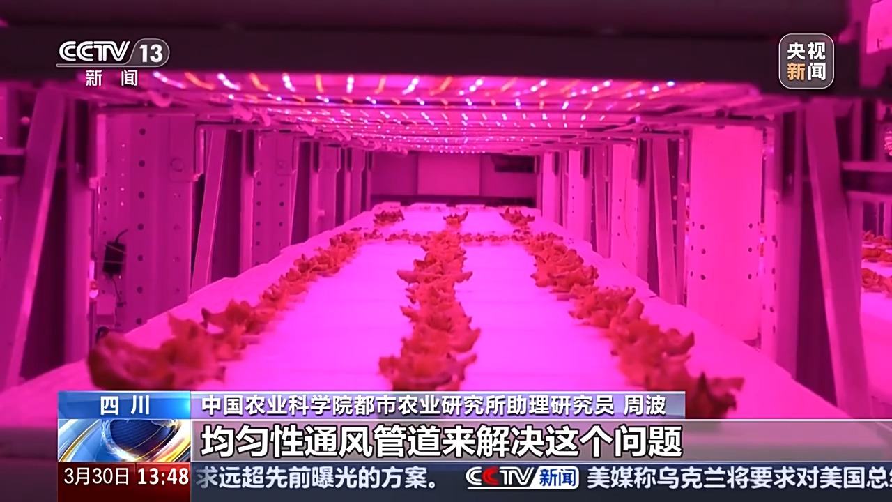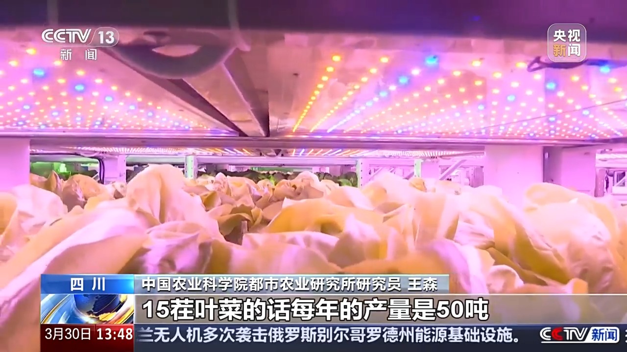 *中國農業科學院都市農業研究所研究員 王森:*植物工廠佔地面積是200平方米,栽培架栽培面積只有100平方米,但實際上我們每年可以生產15茬葉菜,每年產量是50噸,生產效率跟同面積大田相比提高100倍以上。