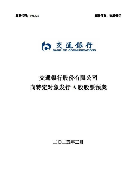 交通銀行公告,2025年3月30日,董事會*審議通過並披露向特定對象發行A股股票方案。*交通銀行本次發行股票數量不超過137.77億股,計劃募集資金總額1200億元,發行對象為財政部、中國煙草總公司及其全資子公司中國雙維投資有限公司。本次發行價格較交通銀行近期A股二級市場價格有一定溢價,發行對象承諾長期持有本次認購股份。本次定增的募集資金將用於補充交通銀行核心一級資本。