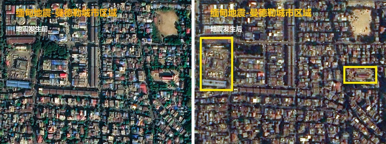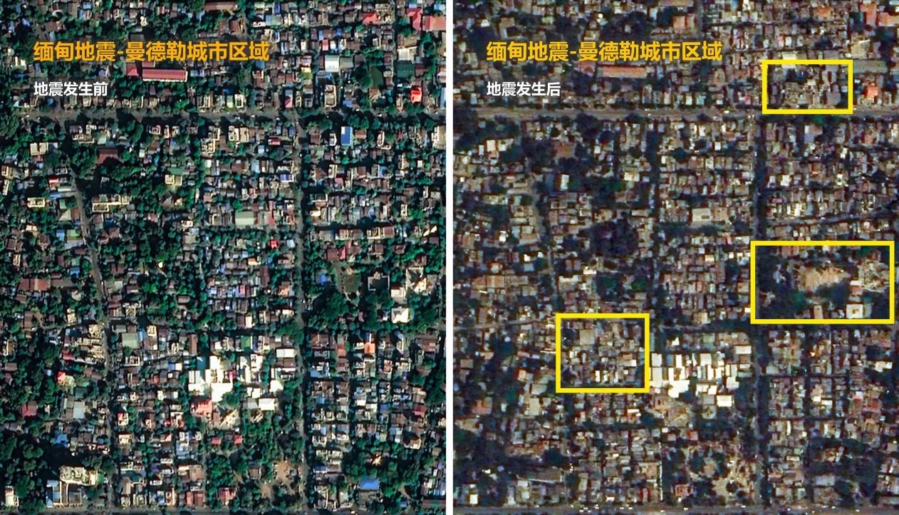 此外,長光衞星吉林一號高分03D14星於3月29日拍攝的衞星影像顯示,曼德勒市區內大量建築物倒塌。倒塌的建築中包括一些高層建築和大型的佛塔。