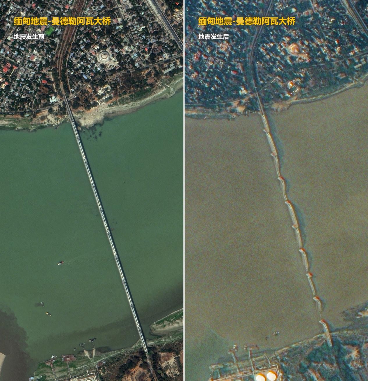 長光衞星吉林一號東坡08星於3月29日拍攝的衞星影像顯示,地震導致緬甸伊洛瓦底江上,連接曼德勒省與實皆省的地標性建築——阿瓦大橋出現嚴重損毀,部分地方還出現坍塌,當地交通和基礎設施受到嚴重影響。
