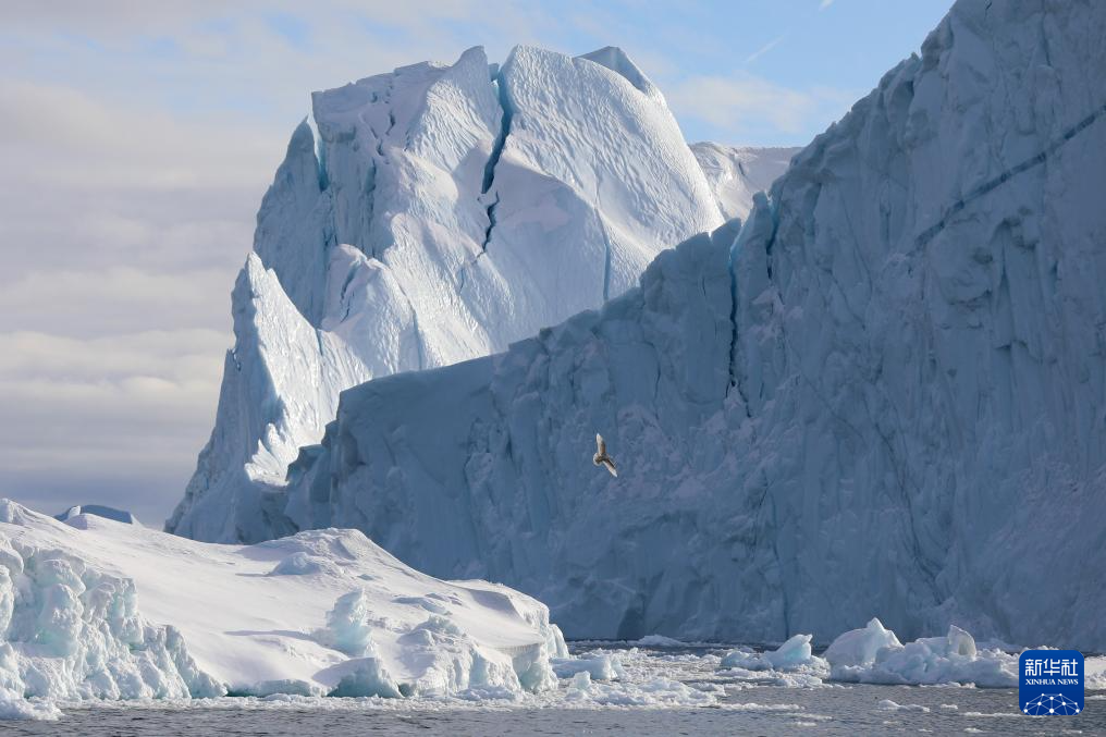 3月22日,在丹麥自治領地格陵蘭島迪斯科灣,一隻海鳥從冰山旁飛過。新華社記者 趙丁喆 攝