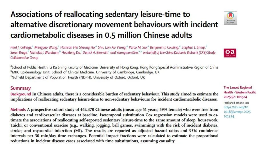 這項發表在《柳葉刀》子刊“The Lancet Regional Health-Western Pacific ”的研究,分析了近50萬中國人發現,每天少坐30分鐘,心血管健康大不同。