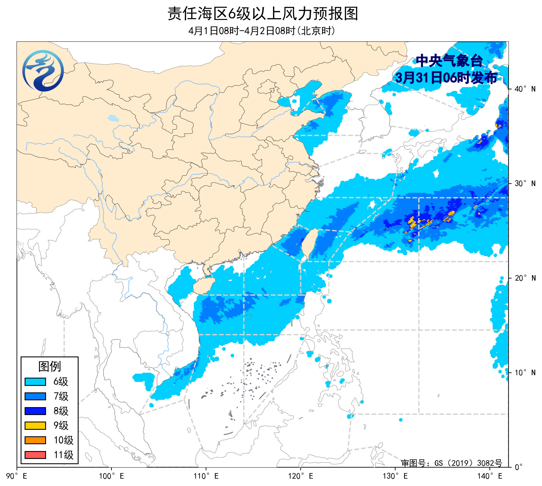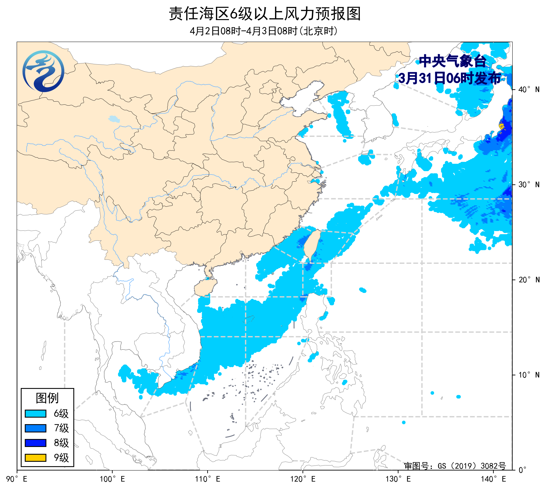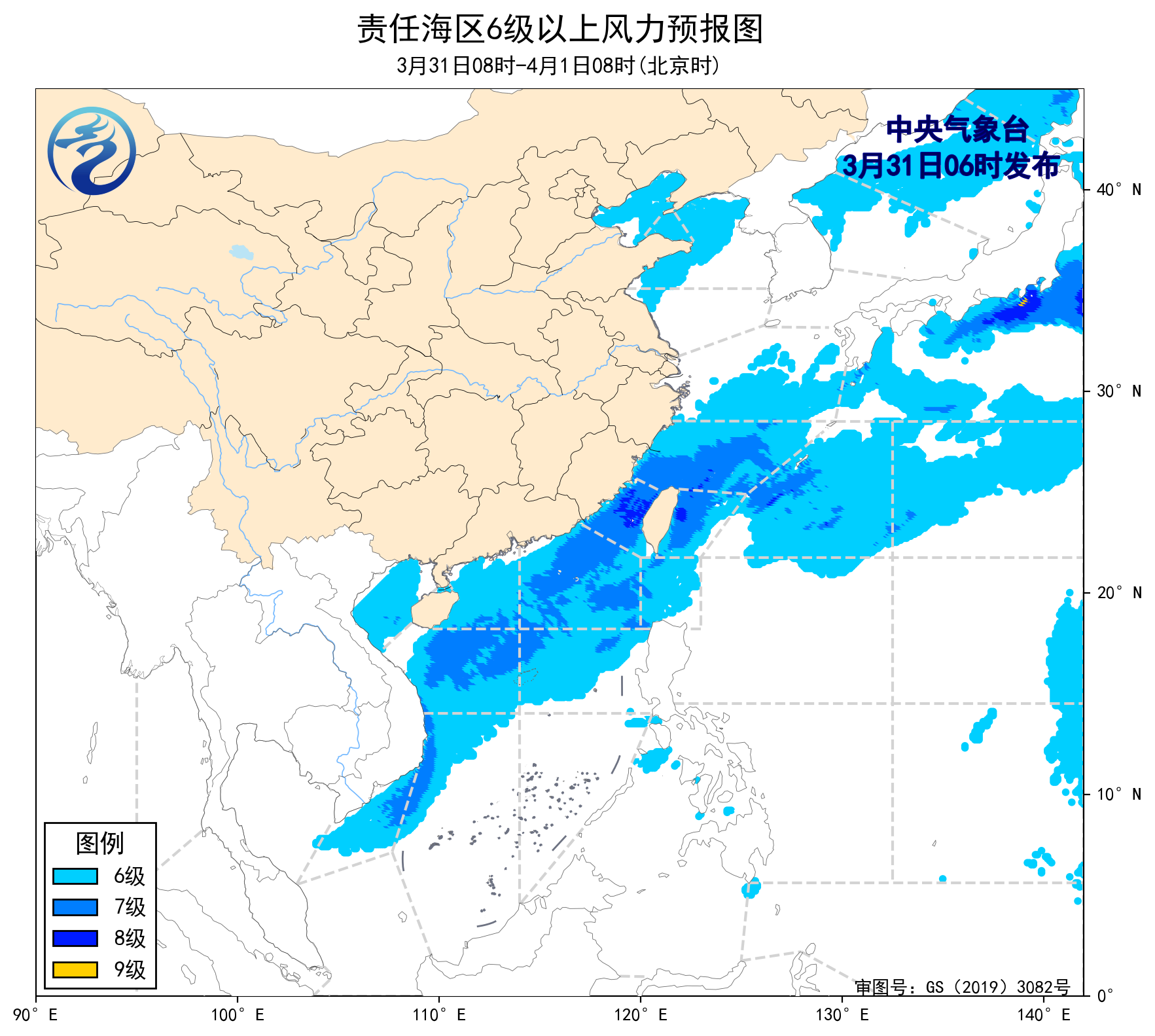 3月31日08時至4月1日08時,東海南部海域、台灣海峽、台灣以東洋麪、南海東北部海域將有5~7級、陣風8級的偏北到東北風,渤海、渤海海峽、黃海北部和中部海域將有4~6級、陣風7級的偏南到西南風,東海北部海域、巴士海峽、北部灣、南海西北部、中東部和南海西南部海域將有5~6級、陣風7級的偏北到東北風。