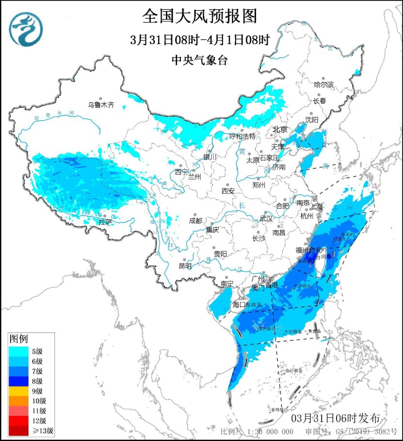另外,3月31日至4月1日,受高空槽影響,內蒙古中東部、華北北部和西部、山東半島及青海南部、西藏中北部等地等地有4~6級風,陣風7~8級。