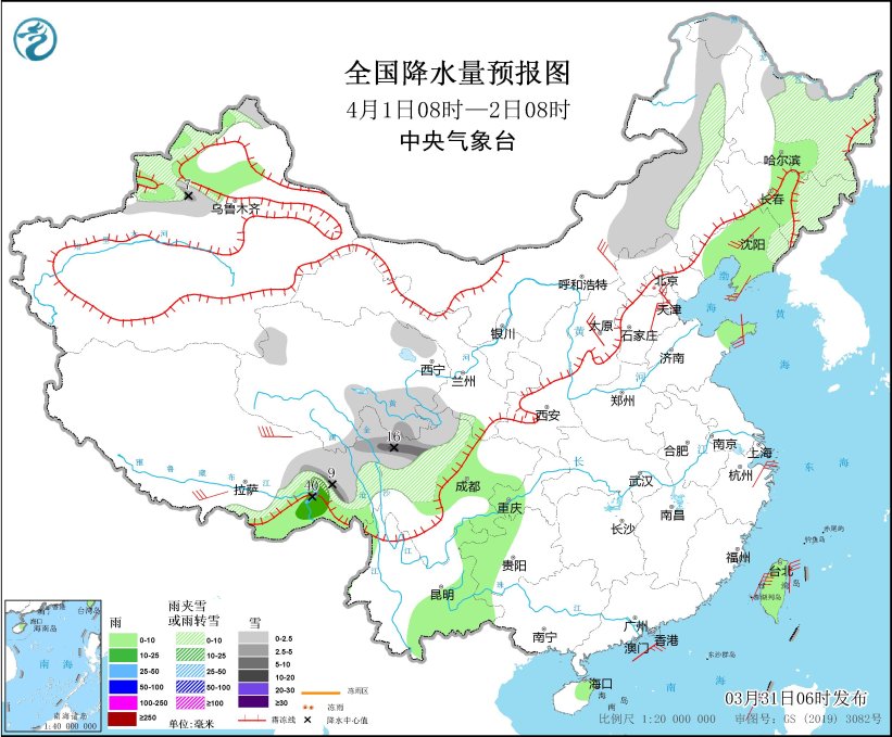 3月31日至4月2日,西藏東部,川西高原北部、青海東南部等地有小到中雪或雨夾雪,其中,西藏東部、川西高原北部、青海東南部等地部分地區有大雪,局地暴雪。此外,西藏東南部、江南東南部、華南中東部及西南地區東部等地有小到中雨,台灣島北部部分地區有大到暴雨。