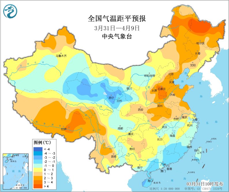 未來10天,除新疆東部、甘肅西部、青海北部及華南東部等地平均氣温較常年同期偏低1~2℃外,我國其餘大部地區氣温較常年同期偏高,其中內蒙古東北部、東北地區西部和北部、華北中南部、黃淮及青藏高原中東部等地偏高2~4℃。