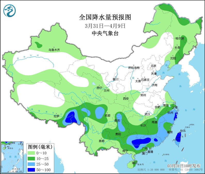 3月31日-4月2日,西藏東部,川西高原北部、青海東南部等地有小到中雪或雨夾雪,其中,西藏東部、川西高原北部、青海東南部等地部分地區有大雪,局地暴雪。此外,西藏東南部、江南東南部、華南中東部及西南地區東部等地有小到中雨,台灣島北部部分地區有大到暴雨。