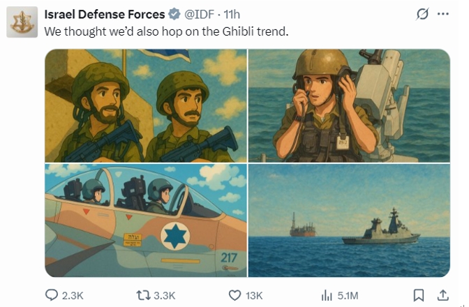 以色列國防軍社媒賬號發佈AI生成的以軍“吉卜力風格”圖片,被網友譴責