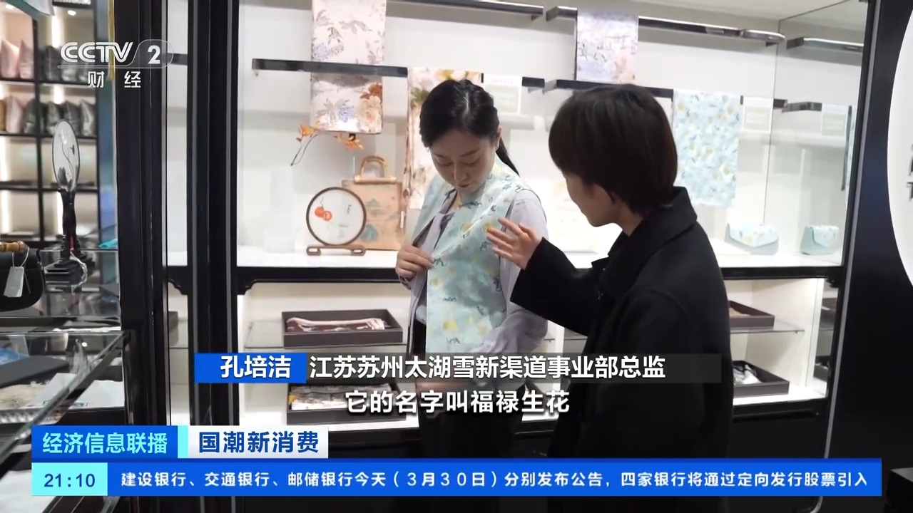 *江蘇蘇州太湖雪新渠道事業部總監 孔培潔:*它的元素有中國傳統的葫蘆、蝙蝠還有花,名字叫福祿生花,寓意福祿雙全,一路生花。這是跟我們馬甲同款的披肩、包,我們還有很多宋錦禮盒。整個宋錦細分的銷量增長了100%。