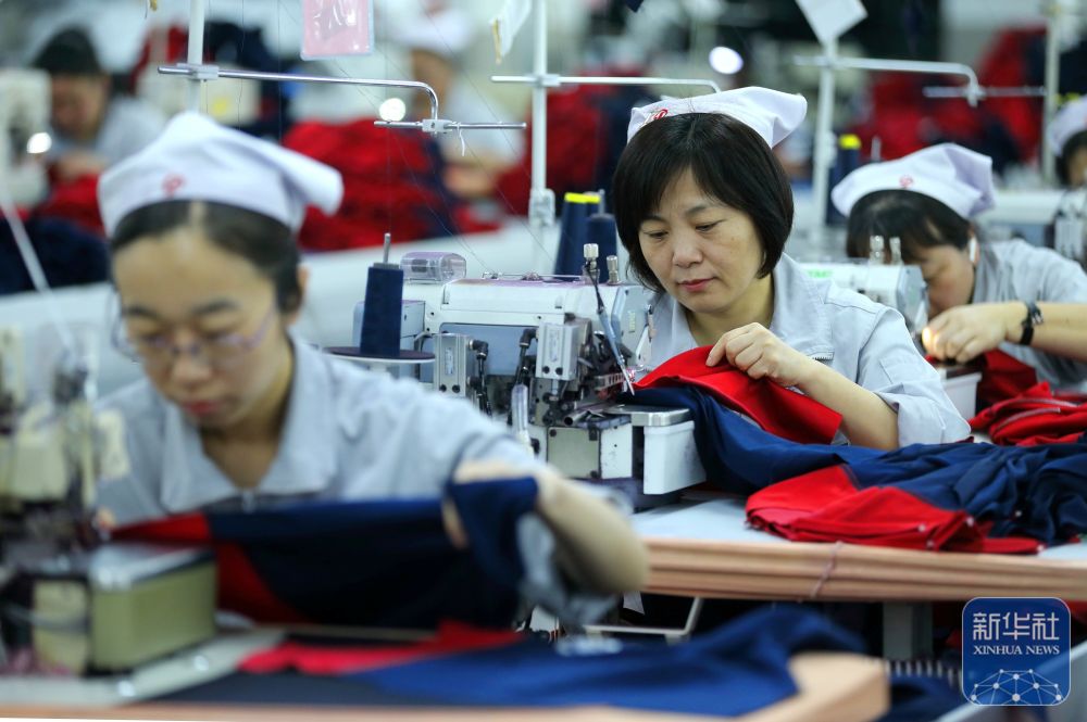 ↑ 3月30日,山東省青島市即墨區即發集團有限公司的員工在生產出口到海外的服裝產品。新華社發(梁孝鵬攝)