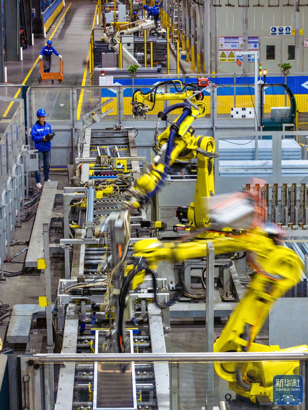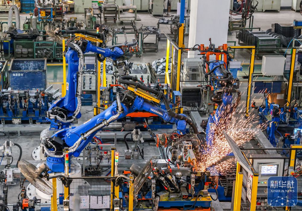 ↑ 3月29日,在江蘇省江都高新技術產業開發區揚州市洪泉實業有限公司,工業機器人在智能生產車間作業。新華社發(任飛攝)
