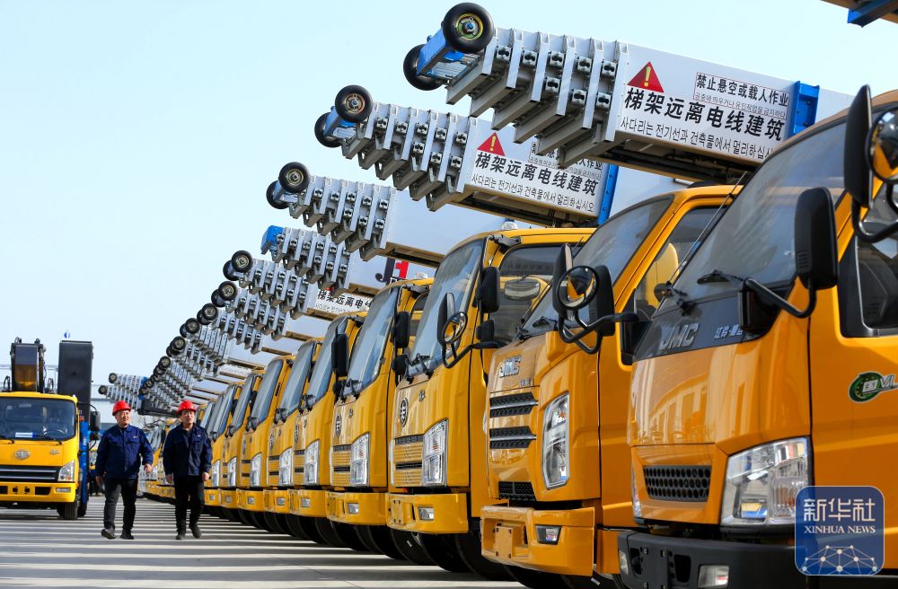 ↑ 3月30日,在位於山東省青島市即墨區金口鎮的青島九合重工機械有限公司,員工盤點待出廠的雲梯車。新華社發(梁孝鵬 攝)