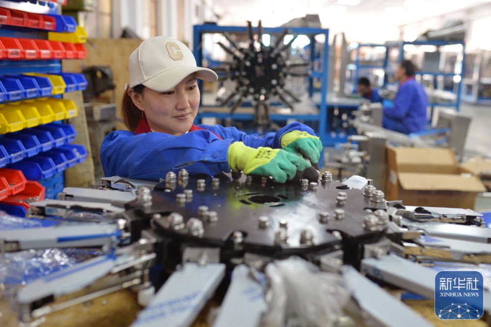 ↑ 3月30日,在山東省青島市城陽區夏莊街道青島義龍裝備製造股份有限公司生產車間內,工人在組裝包裝機。新華社發(王海濱攝)