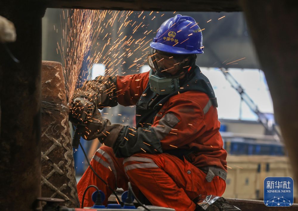 ↑ 3月30日,湖北省中鐵科工軌道交通裝備有限公司工人對造船起重機進行打磨作業。新華社發(趙軍攝)