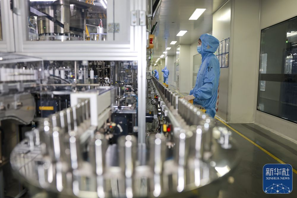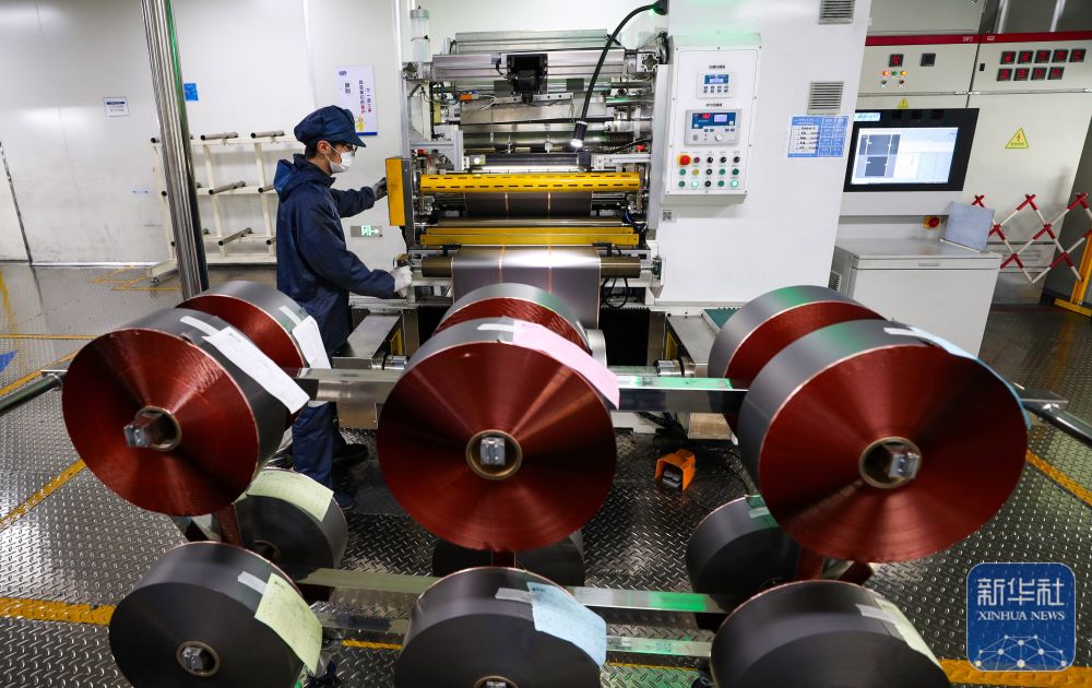 ↑ 3月30日,在江蘇省泰興黃橋經濟開發區長虹三傑新能源有限公司,工人在鋰離子電池生產自動裝配線上作業。新華社發(顧繼紅攝)