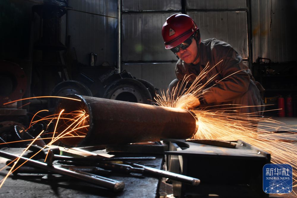 ↑ 3月29日,工人在山東省青島市城陽區青島東林工具有限公司加工車間進行氣割冷油器水管。新華社發(王海濱攝)