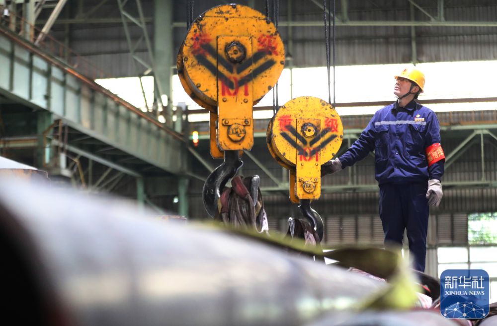 ↑ 3月30日,在湖南衡陽華菱鋼管有限公司生產車間,工人進行鋼管吊裝作業。新華社發(曹正平攝)