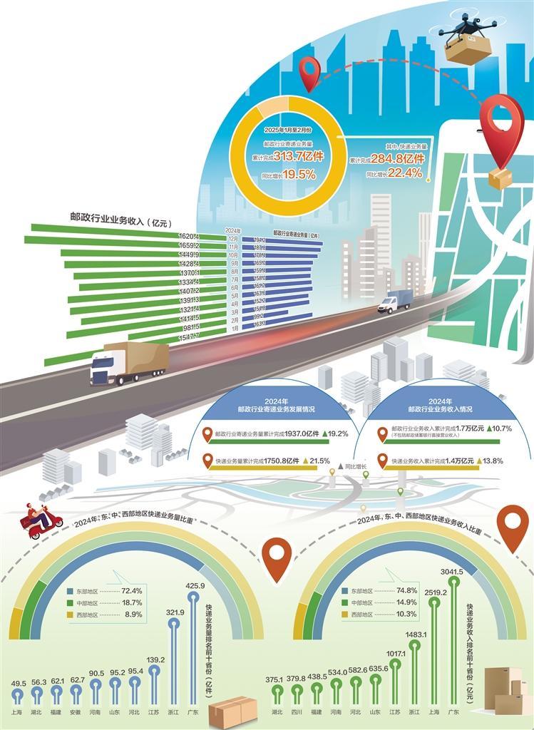 消費是經濟增長的主引擎,快遞業務增長源於消費需求有效釋放。從中央經濟工作會議強調大力提振消費、提高投資效益,全方位擴大國內需求,到今年《政府工作報告》圍繞“大力提振消費”作出工作部署,再到各級政府和有關部門加碼促消費,消費市場活力持續攀升。2025年,消費潛能將加速釋放,快遞業仍將保持穩步上升態勢,更多人會享受到便捷的寄遞服務。(本文來源:經濟日報 作者:吉蕾蕾)