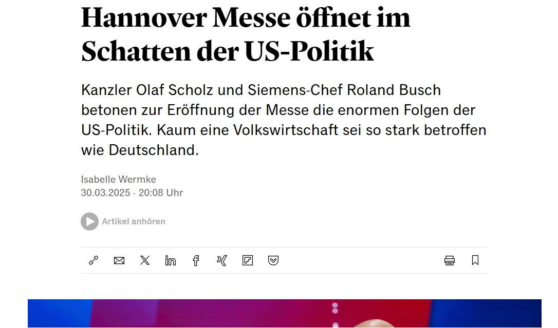 對此,外媒稱,全球最大的工業貿易展覽會將因美國貿易政策而黯然失色。未來,許多德國工業企業也可能受到重創,尤其是受到進口關税和無法進入美國市場的影響。