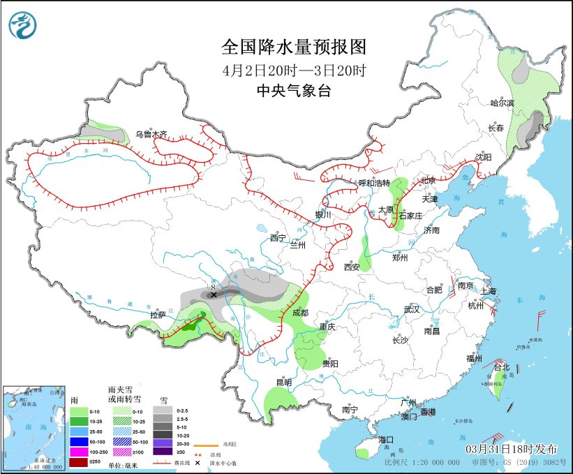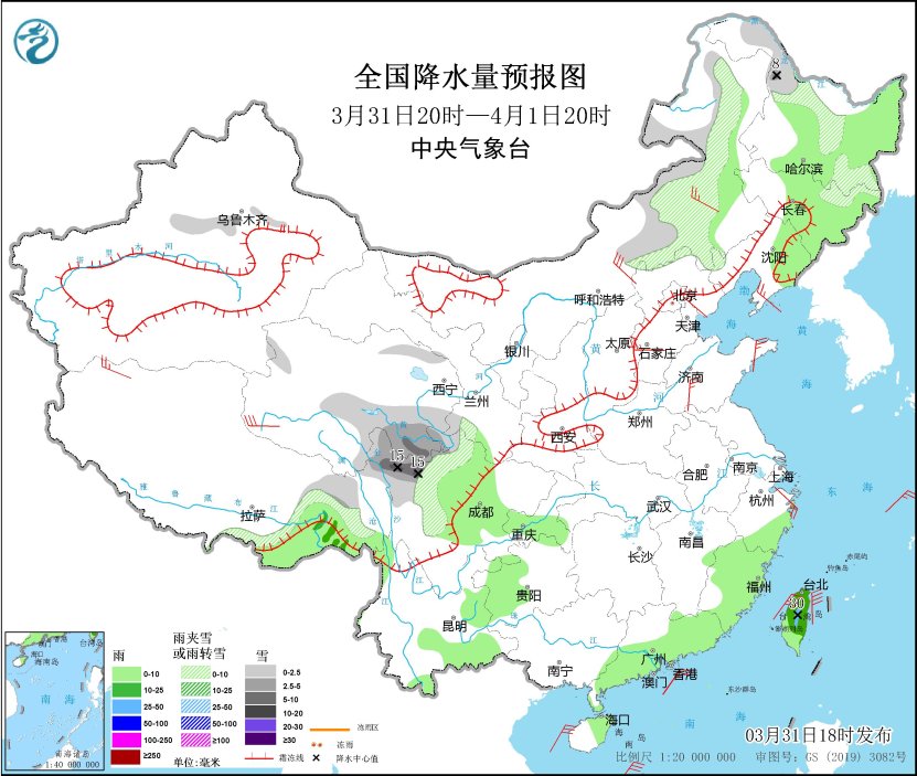 3月31日20時至4月3日20時,西藏東部,川西高原北部、青海東南部、內蒙古中東部、東北地區中北部等地有小到中雪或雨夾雪,其中,西藏東部、川西高原北部、青海東南部等地部分地區有大雪,局地暴雪。此外,西藏東南部、西南地區東部、華南中東部、海南島及台灣島等地部分地區有小到中雨,其中,台灣島中部部分地區有大雨。