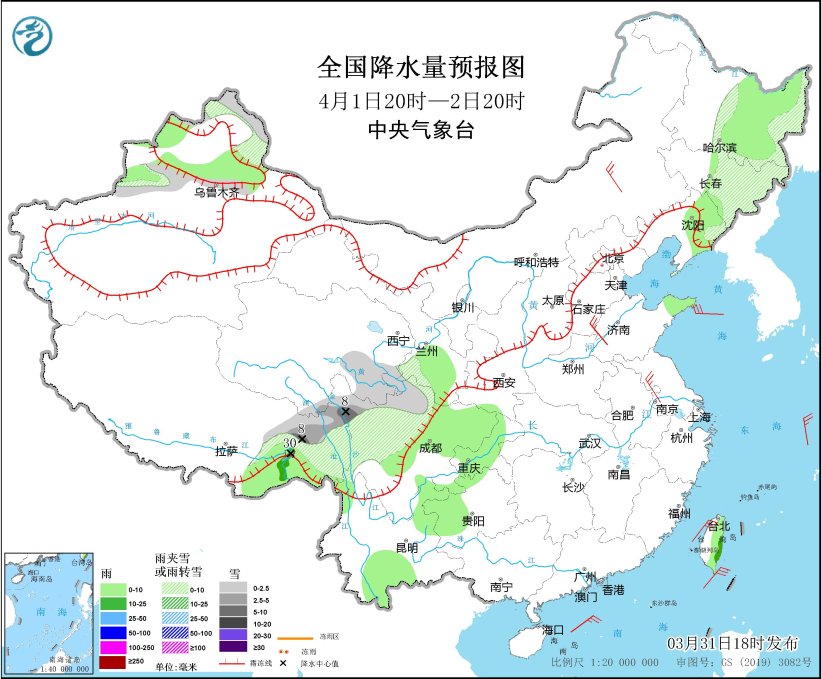 *3月31日20時至4月1日20時,*新疆沿天山一帶、青海東南部、西藏東北部、川西高原北部、內蒙古中東部、黑龍江西北部和東南部等地部分地區有小到中雪或雨夾雪,其中,青海東南部、川西高原西北部以及黑龍江西北部等地部分地區有大雪,局地暴雪(10~15毫米)。黑龍江中部和東北部、吉林中東部、遼寧東部、西藏東南部、四川盆地中部、重慶南部、貴州西部、雲南東部、華南中南部、浙江南部、海南島以及台灣島等地部分地區有小雨,其中,西藏東南部、台灣島中北部等地部分地區有中到大雨(25~30毫米)。內蒙古中東部、華北、遼東半島、山東半島、浙江東部沿岸、西藏北部以及青海西部等地部分地區有4~6級風;渤海、渤海海峽、黃海西部、東海中南部、台灣海峽、台灣以東洋麪、巴士海峽、南海中北部以及北部灣等海域有6~7級風,陣風8~9級(見圖1)。