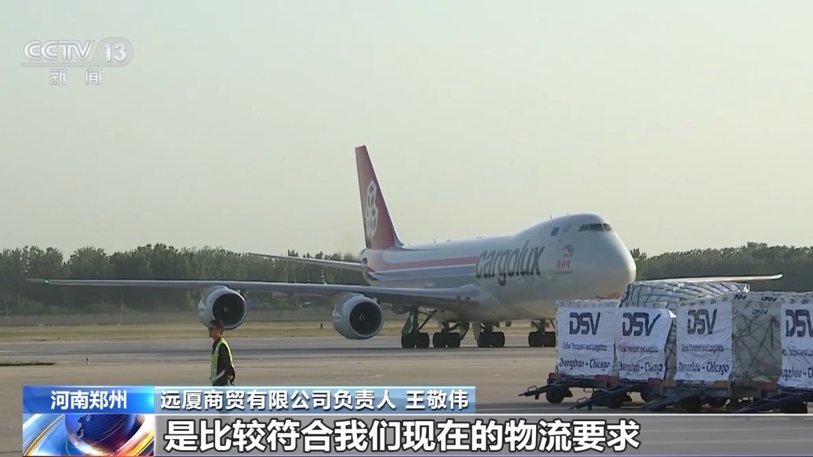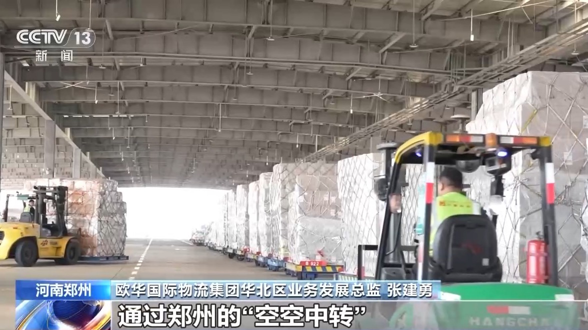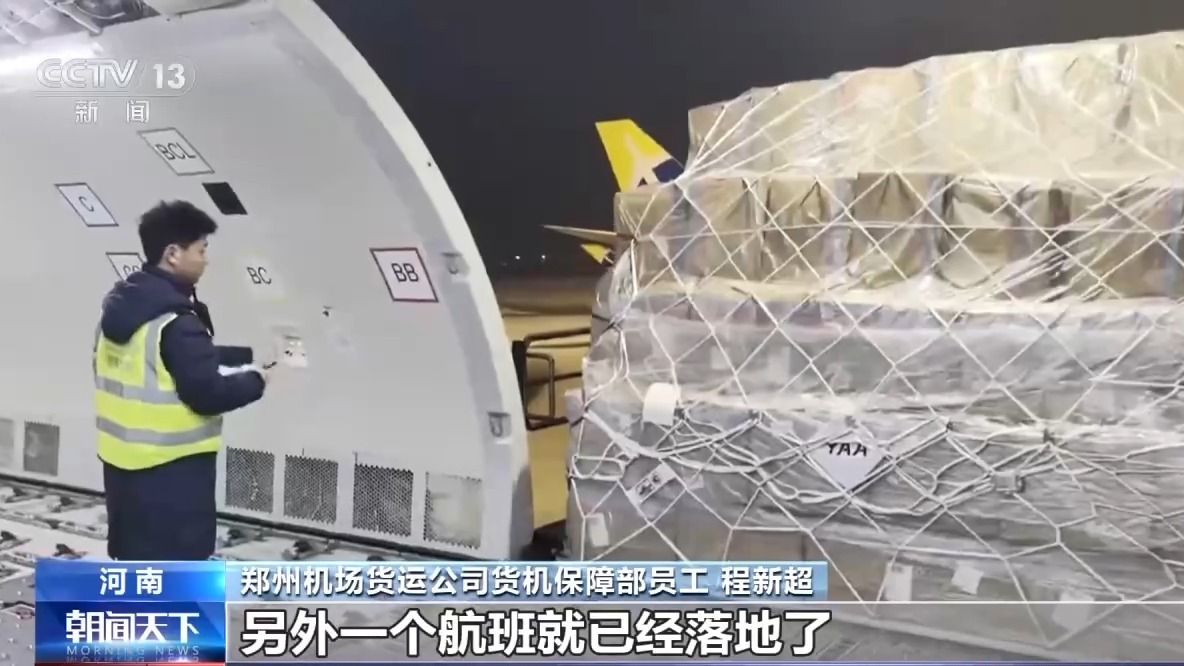 新朋友入駐,老朋友的業務也在拓展。記者採訪期間,一架從韓國飛來的全貨機剛剛落地,工作人員告訴記者,這架全貨機是通過“空空中轉”將電子產品等貨物從韓國首爾運抵鄭州,隨後再轉運至印度金奈。