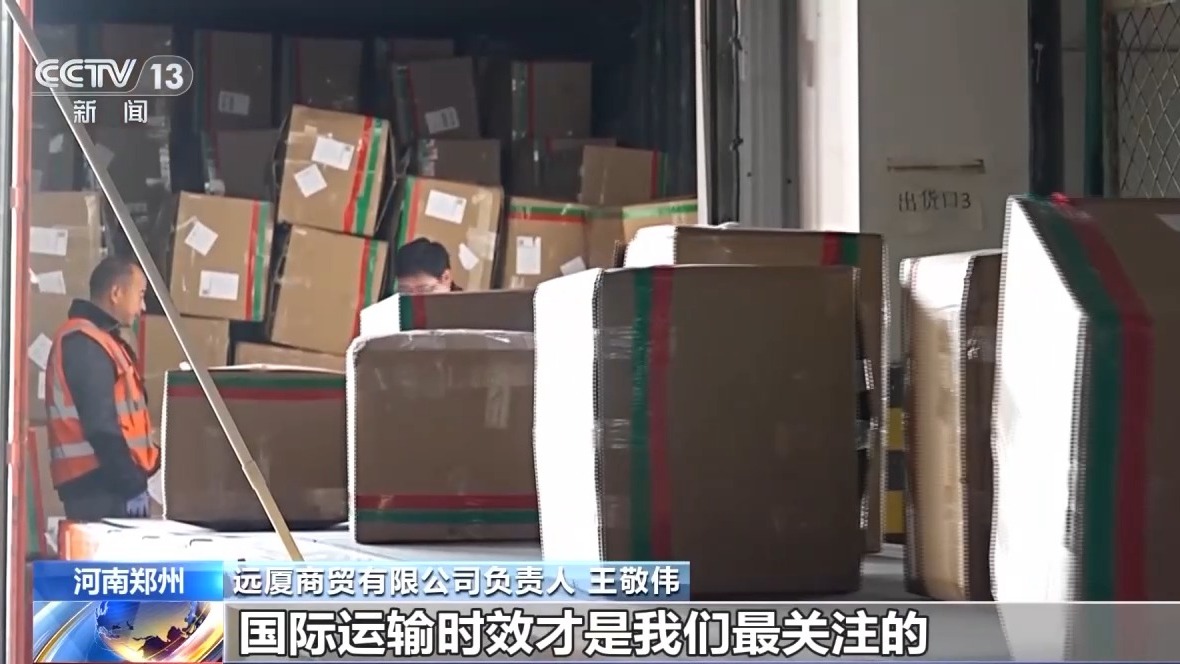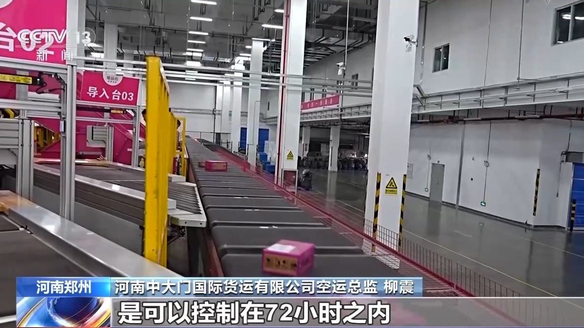 *河南中大門國際貨運有限公司空運總監 柳震:*從國內工廠提貨,到整個航班在境外口岸落地,我們整體的時效是可以控制在72小時之內,完全符合高效運轉的時效要求。