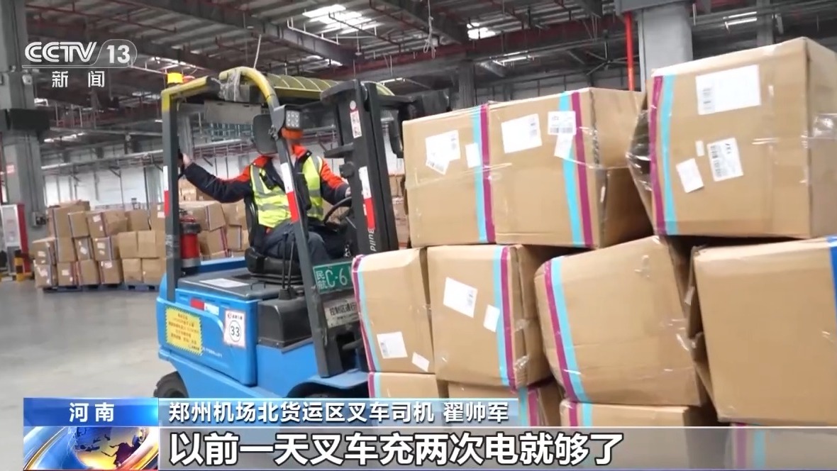 *鄭州機場北貨運區叉車司機翟帥軍:*飛機航班多不多,裝得滿不滿,看我這邊就知道,以前一天叉車充兩次電就夠了,現在要充四次電。