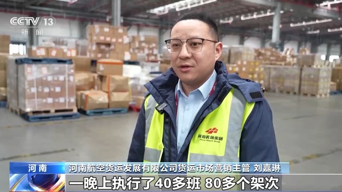*河南航空貨運發展有限公司貨運市場營銷主管 劉嘉琳:*最繁忙的時候,一晚上執行了40多班,80多個架次。每一個環節、每個時間節點我們都有監控,哪個節點出現問題了,耽擱的時間比較長了,後台對現場進行提醒。高峯期加派人員,大大提高了作業效率。