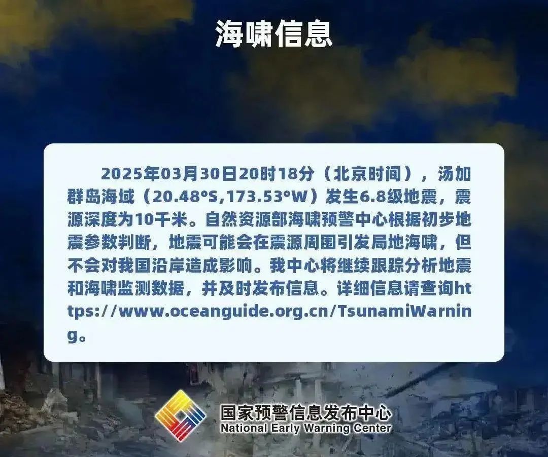 自然資源部海嘯預警中心根據初步地震參數判斷,地震可能會在震源周圍引發局地海嘯,但不會對我國沿岸造成影響。目前,美國海嘯預警中心已經解除湯加海嘯警報。