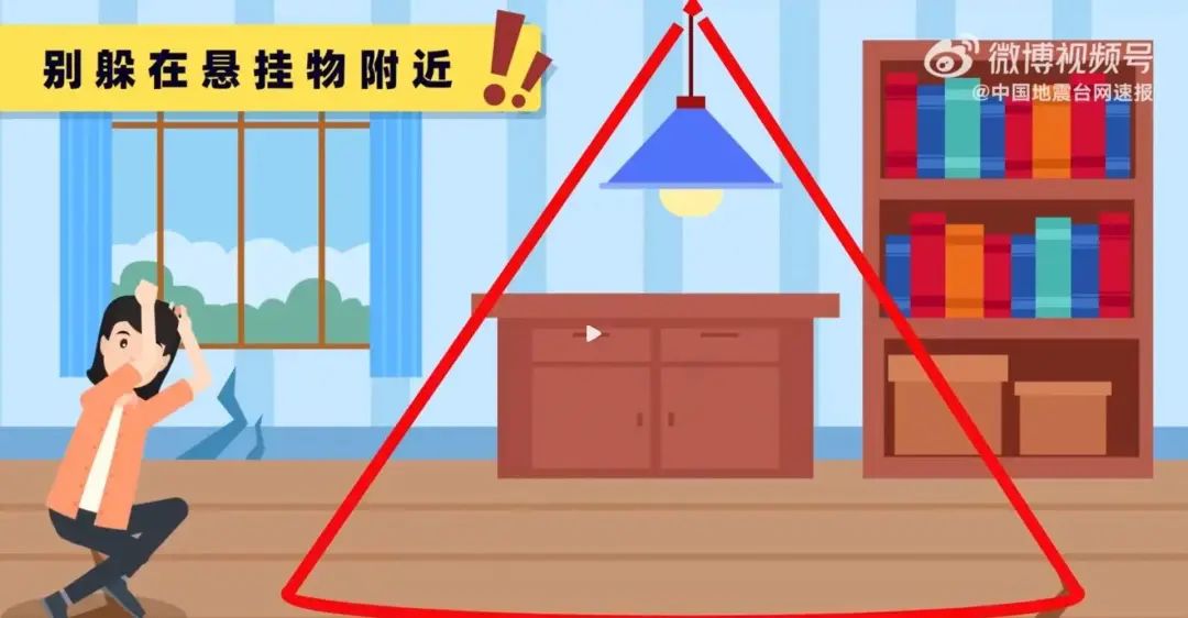 別躲在懸掛物附近:地震時未被固定的物體容易墜落傷人,務必遠離可能位移或掉落的位置。