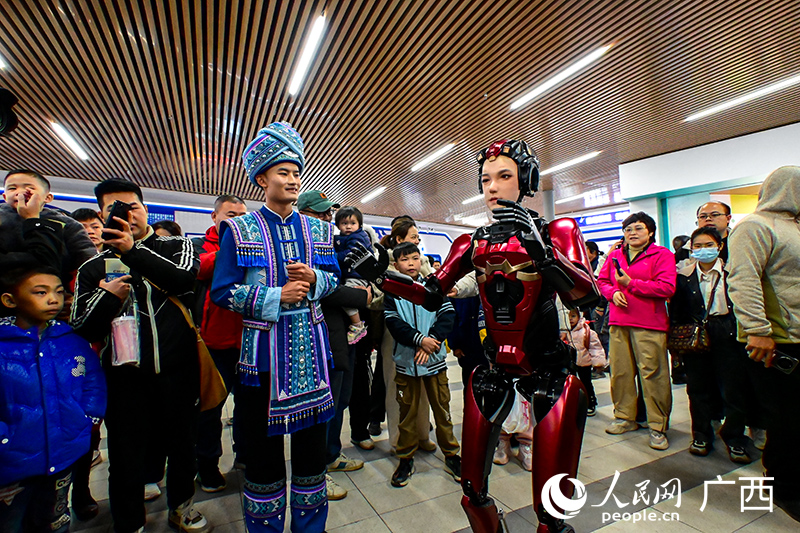 “阿牛哥”與AI人形機器人“劉三姐”組起CP進行對唱,帶來前所未有的對歌體驗;曾在央視春晚亮相的宇樹機器人換上壯錦馬甲,攜手廣西街舞少年解鎖“科目三”新玩法。