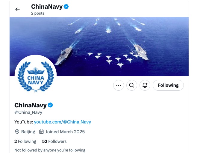 ChinaNavy賬號下方藍色的“✔︎”表示該賬號已被確認為中國海軍官方賬號,背景圖是雙航母編隊。該賬號目前已發佈兩條帖文。最新一條顯示:我們是中國海軍。從亞丁灣護航到海外救援,從遠海醫療服務到執行人道主義撤離任務,我們帶着責任和希望,在大洋彼岸航行。我們是捍衞主權和每一寸領土的守護者,也是打造海洋命運共同體的夥伴。