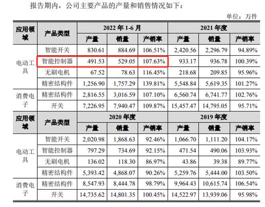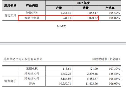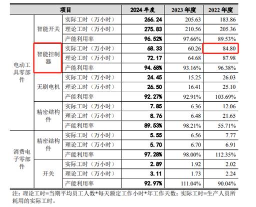 數據異常的還有華之傑產品產量與工時。招股書顯示,2022年上半年華之傑智能控制器產量491.53萬件,實際工時36.7萬小時;下半年產量降至452.64萬件,實際工時卻升至48.1萬小時。