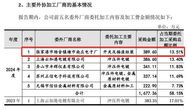 此外,華之傑子公司華捷電子的註冊地址(張家港市新涇西路3號)與外協供應商張家港市楊舍鎮塘市南莊電子廠在2017年9月至2020年3月期間完全一致。南莊電子廠2017年9月成立,成立次年即成為華之傑第一大外協供應商,2024年交易額389.6萬元,但該廠員工僅3人,產能與交易規模嚴重不匹配。