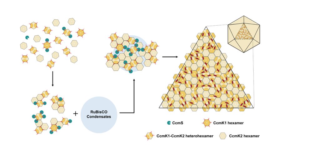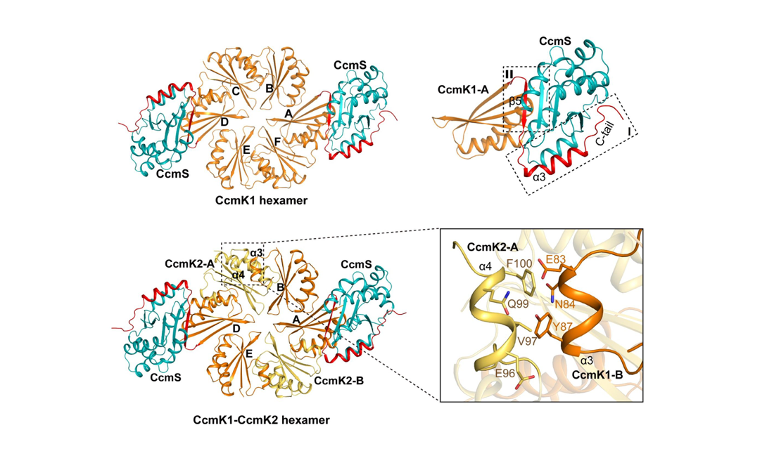 光合作用是地球上最重要的生物化學反應,為幾乎所有生物提供物質和能量,是維持生物圈穩態的基礎。作為地球上最古老的光合自養微生物,藍細菌每年固定CO2的總量約佔全球生物固碳的30%,是地球碳匯的主要貢獻者。藍細菌光合固碳的獨特之處在於,其為應對環境中不斷降低的CO2濃度,進化出CO2濃縮機制(CO2 concentratingmechanism, CCM),通過一系列的轉運體將環境中的無機碳運輸到細胞中,並在固碳機器羧酶體(carboxysome)內高度富集,從而提高固碳酶RuBisCO的催化效率。羧酶體是一種直徑約100~300 nm的正二十面體,由外殼蛋白封裝RuBisCO和碳酸酐酶有序自組裝而成。根據內部被包裹的RuBisCO的種類不同,羧酶體分為α和β兩種類型。其中β-羧酶體的外殼主要由BMC-H家族蛋白CcmK自組裝形成,在模式藍藻Synechocystissp. PCC 6803的β-羧酶體中,BMC-H有4個同源蛋白CcmK1-4,其中CcmK1和CcmK2為主要外殼蛋白,序列一致性超過90%,但與CcmK2相比,CcmK1具有C末端額外8個氨基酸殘基。